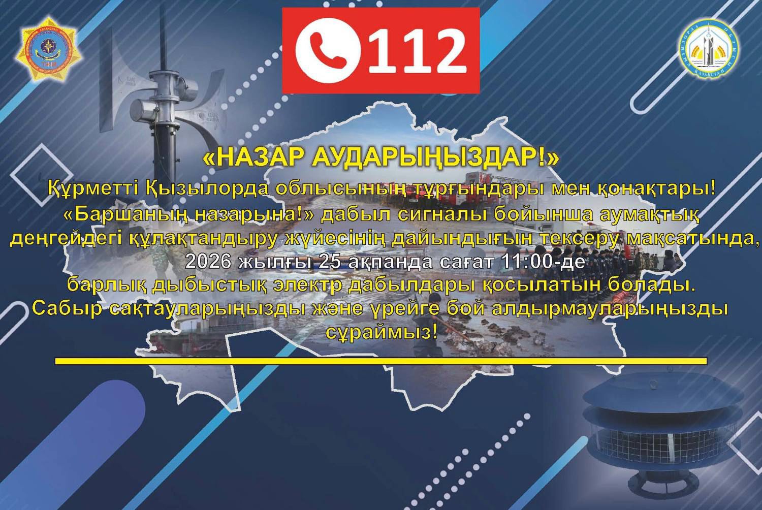 Құрметті Қызылорда облысының тұрғындары мен қонақтары!Облыс аумағында өткізілетін «Көктем-2026» республикалық командалық-штабтық оқу-жаттығуы кезінде 2026 жылғы 25 ақпанда сағат 11:00 минутта…