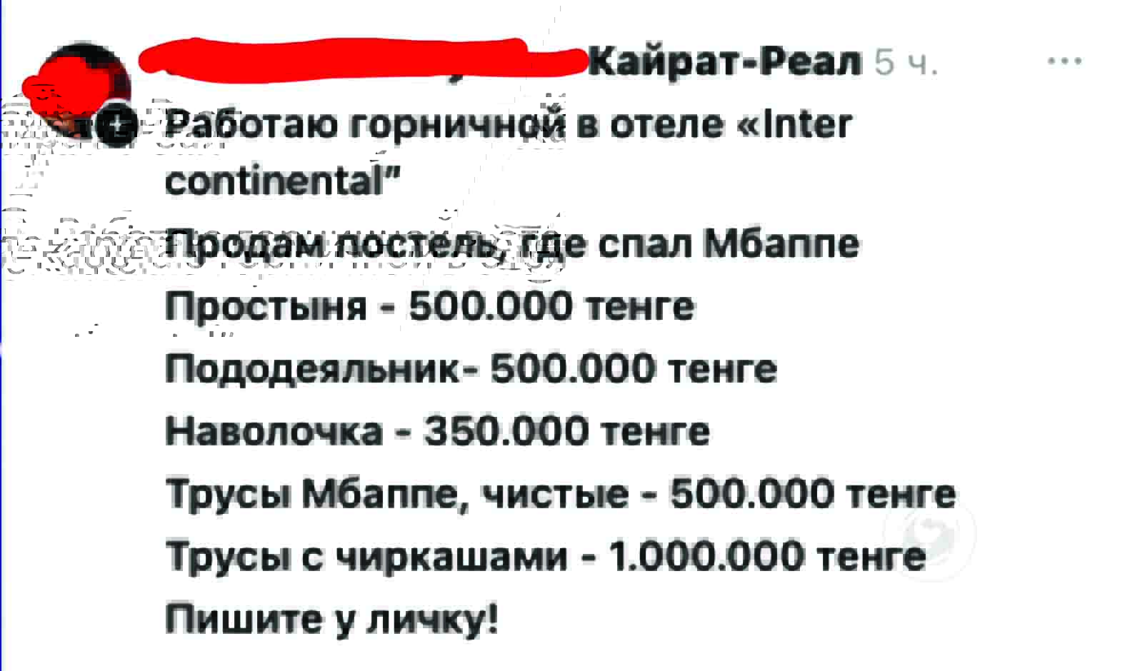 Sport24 тілшісі әлеуметтік желілердің бірінде жарияланған осы жарнама иесімен тілдесіп үлгірген. Жарнама иесі Реал командасы тоқтаған қонақүйдің қызметшісі екен. Оның айтуынша “әлеуметтік желідегі бар әңгі­ме “Қайрат” пен “Реалдың” ойы­нына тіреліп тұрғандықтан, өз мүмкіндігіне қарай ол да қал­жың­дағысы келген. Ол әлеу­меттік желіде әркімнің әр нәрсе сатып жатқанын көріп, осылай қалжыңдағысы келген. Мәселен, бір шопыр ойыншы­лар­мен түскен суретін, енді бір жан­күйерлер ойыншыларды күтіп алға­нын жариялап жатқанда, ол да елді таңқалдырғысы келген. Жалпы спорт әлемінде автографтарды, яғни “Реал” ойыншыларының автографтарын немесе басқа бір заттарын сатып жатқандар жоқ емес. Содан да әзілдегісі келген. Негізі жұрт оның әзілін түсінгендіктен де көп хабарласпады дейді.