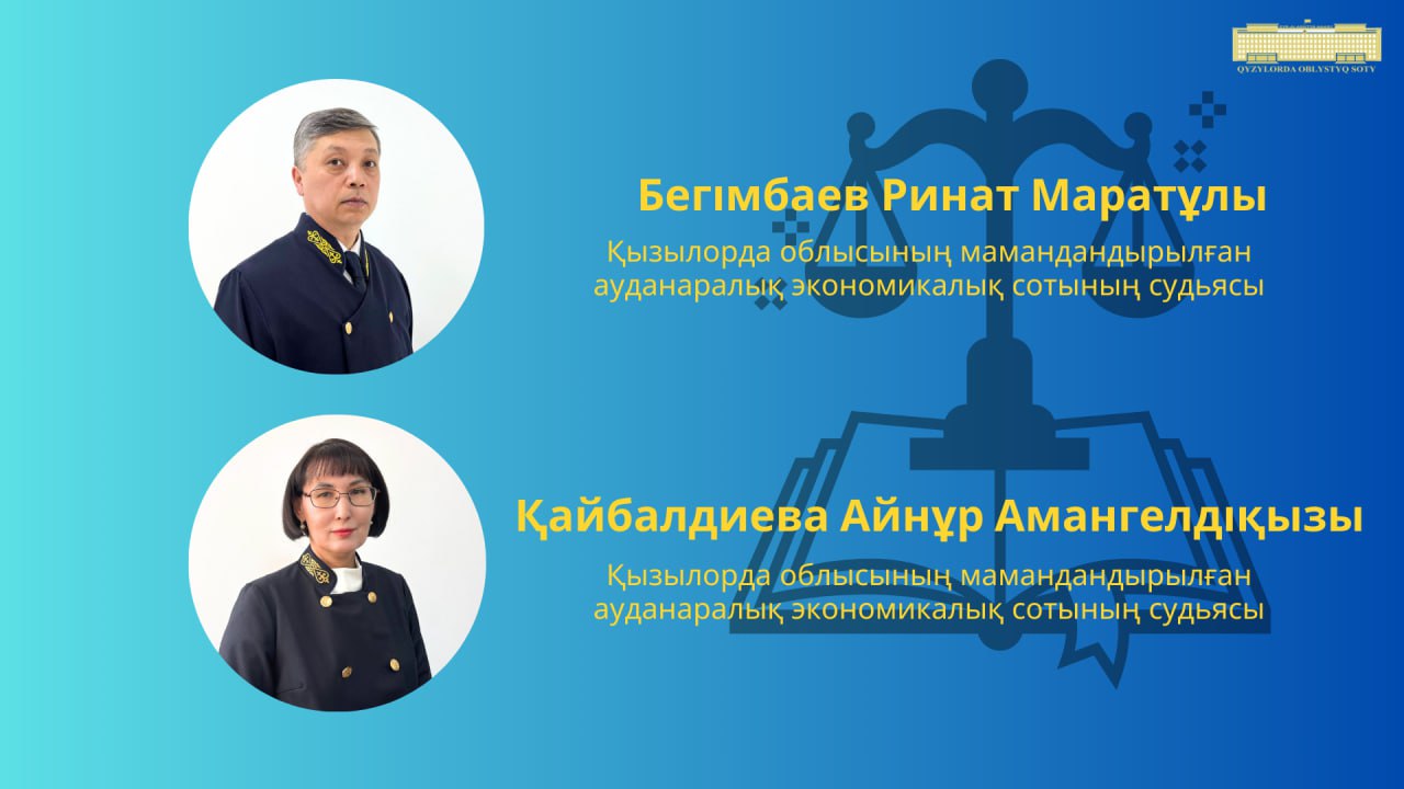 Аталған Жарлықпен Қызылорда облысының мамандандырылған ауданаралық экономикалық сотының судьялары болып Бегімбаев Ринат Маратұлы және Қайбалдиева Айнұр Амангелдіқызы тағайындалды.