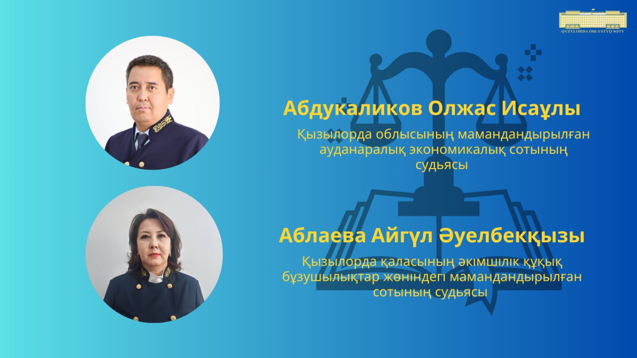 ▪️Абдукаликов Олжас Исаұлы – сот жүйесінде 2009 жылдан бастап қызмет атқарып келеді, 2015 жылдан бастап осы уақытқа дейін Қызылорда қаласының әкімшілік құқық бұзушылықтар жөніндегі мамандандырылған сотының судьясы қызметін атқарған.